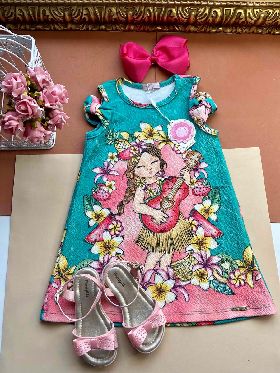 VESTIDO INFANTIL ESTAMPADO COM O FUNDO VERDE, UMA BONECA NA FRENTE. LINDO E CONTOFRTÁVEL DA MARCA MON SUCRÉ