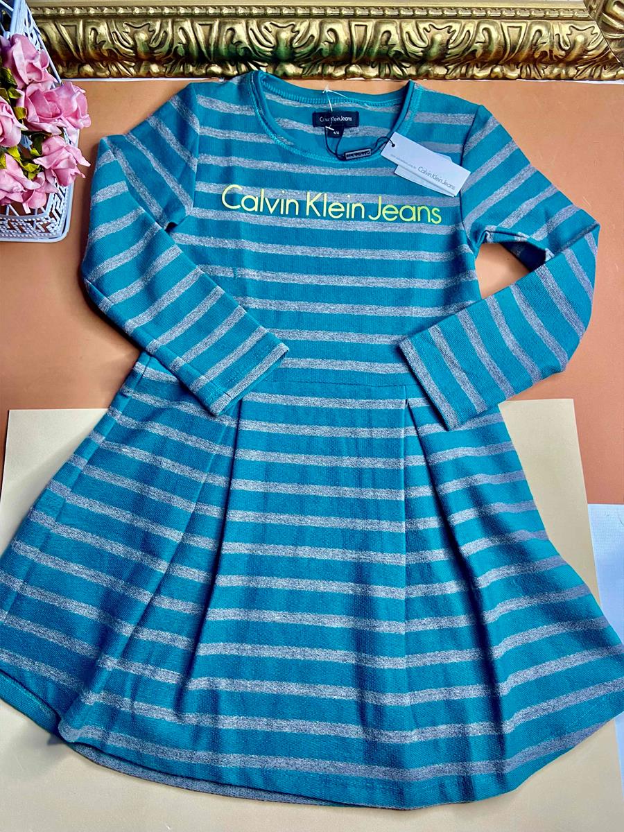 VESTIDO INFANTIL LISTRADO VERDE, DE MANGA LONGA, DA MARCA CALVIN KLEIN