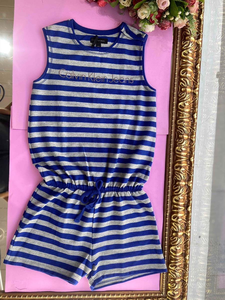 MACAQUINHO INFANTIL LISTRADO DE AZUL E CINZA, COM ELÁSTICO NA CINTURA, DA MARCA CALVIN KLEIN JEANS