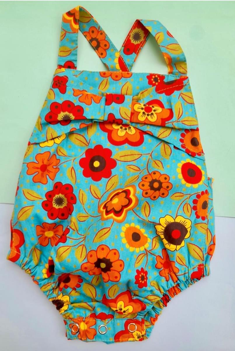 ROMPER DE BEBÊ PITCHUCA, NA COR AZUL E FLORES COLORIDAS