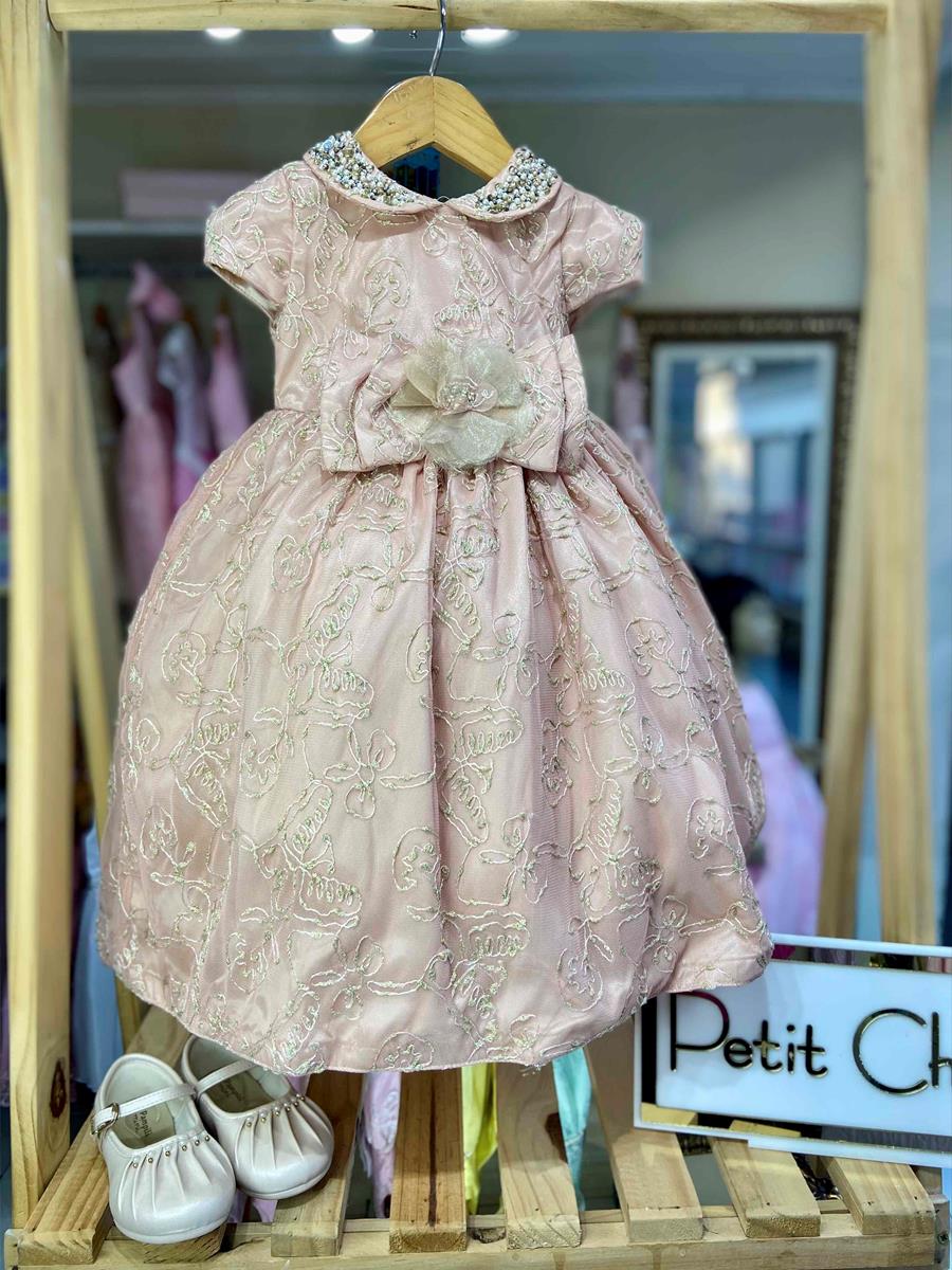 VESTIDO DE FESTA INFANTIL PETIT CHERIE, NUDE BORDADO, COM APLICAÇÃO DE PEROLAS E PEDRINHAS NA GOLA
