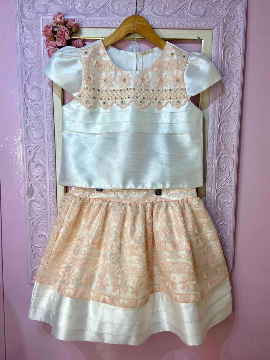 CONJUNTO DE FESTAINFANTIL PETIT CHERIE, OFF WHITE COM BABADINHO E BORDADO ROSA